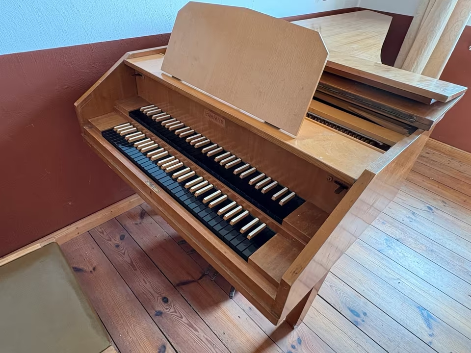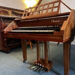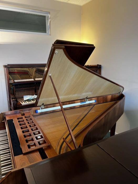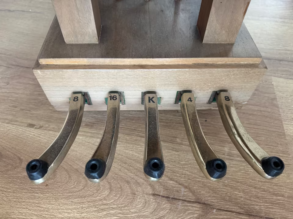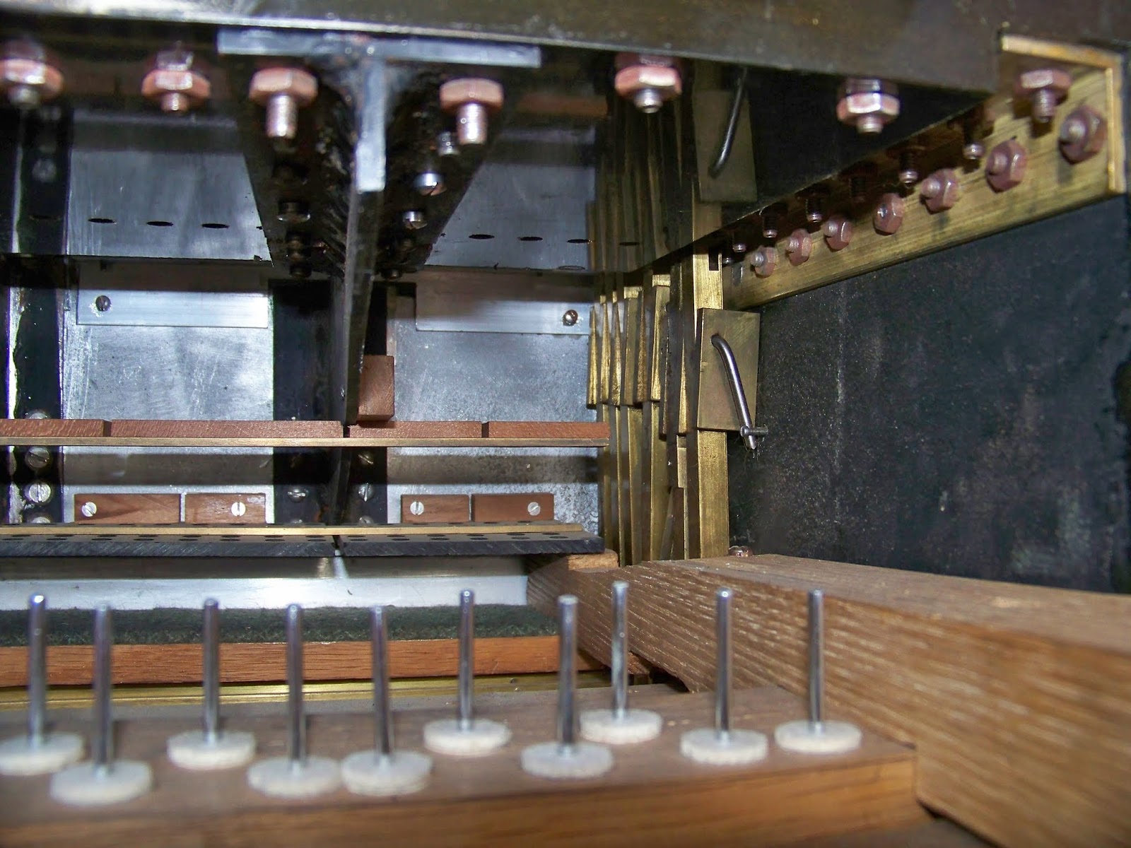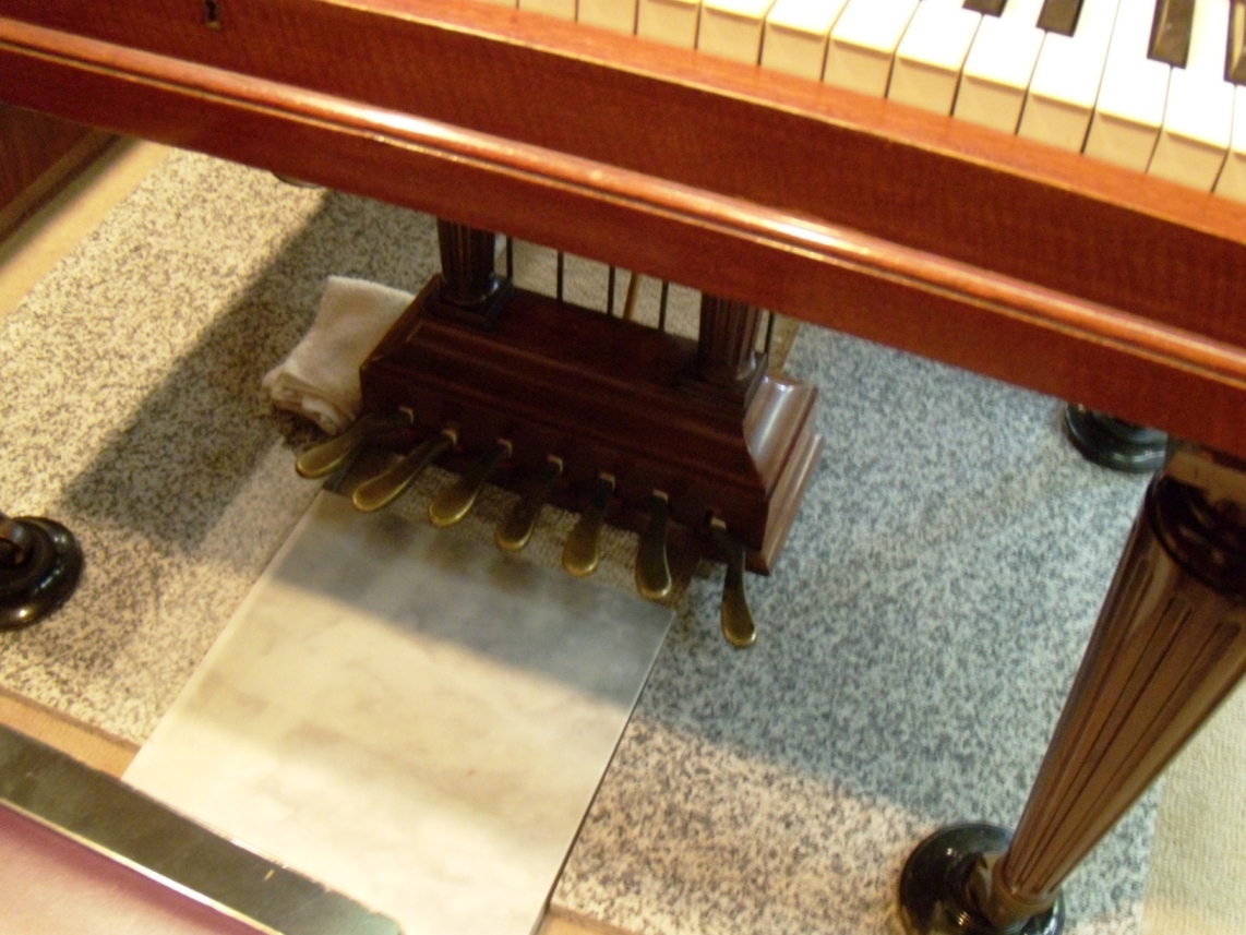 Registre skiftes med syv pedaler. Der er ingen manualkobling, men forreste 8′ har to sæt springere: et til øverste manual og et til nederste manual. Særskilte lutregistre for de to 8′-registre. Til forreste 8′ findes også en piano&forte, som tilsyneladende har været et “half-stop”, dvs trukket springerne lidt væk fra strengene for at give en svagere klang.