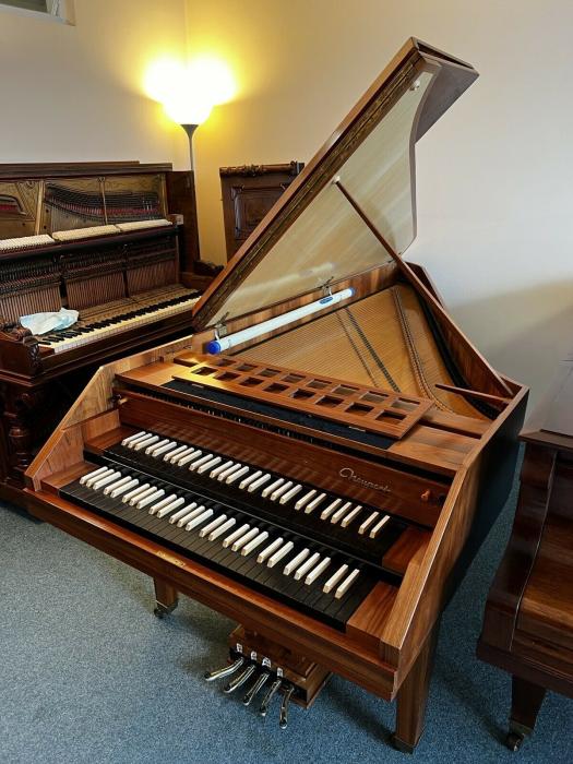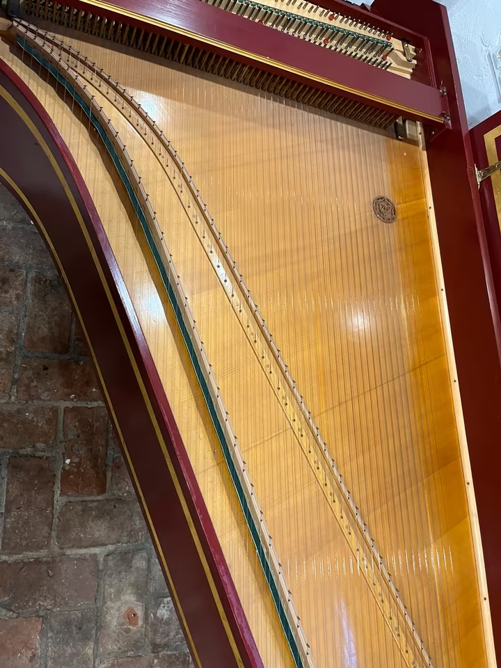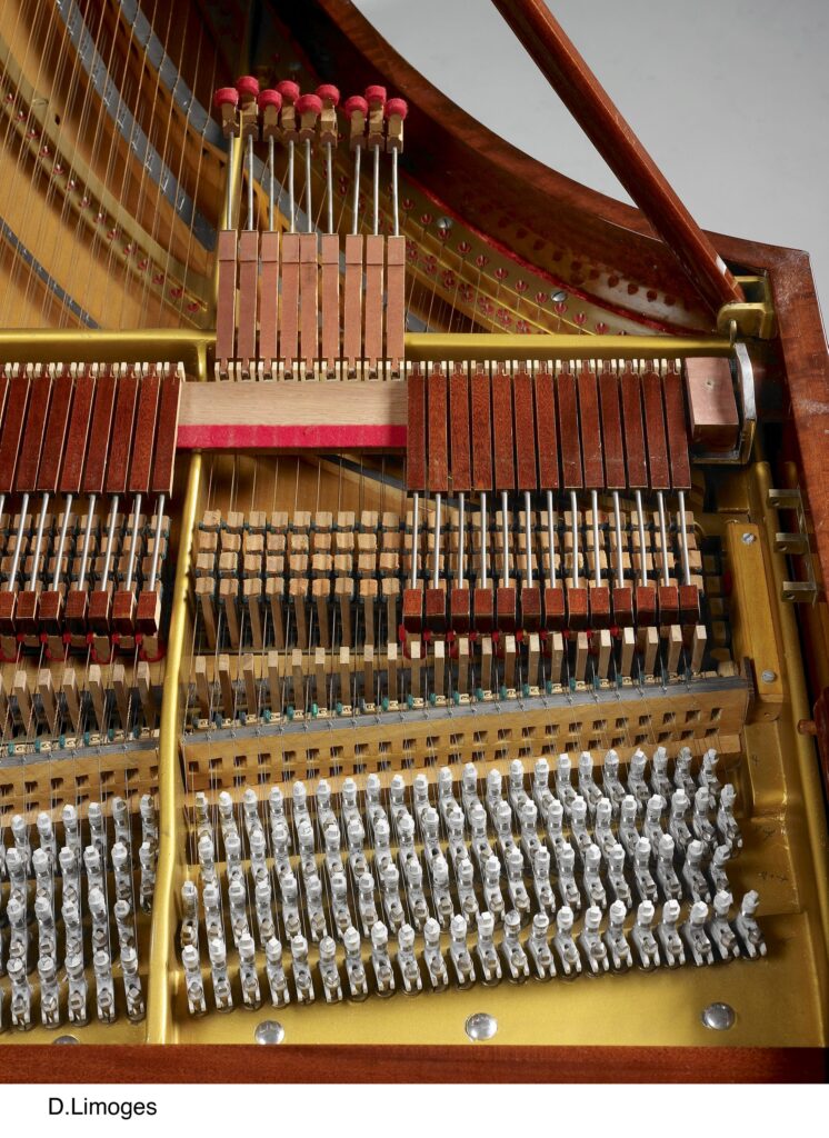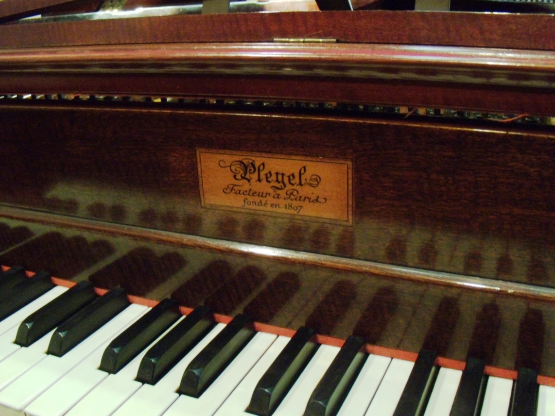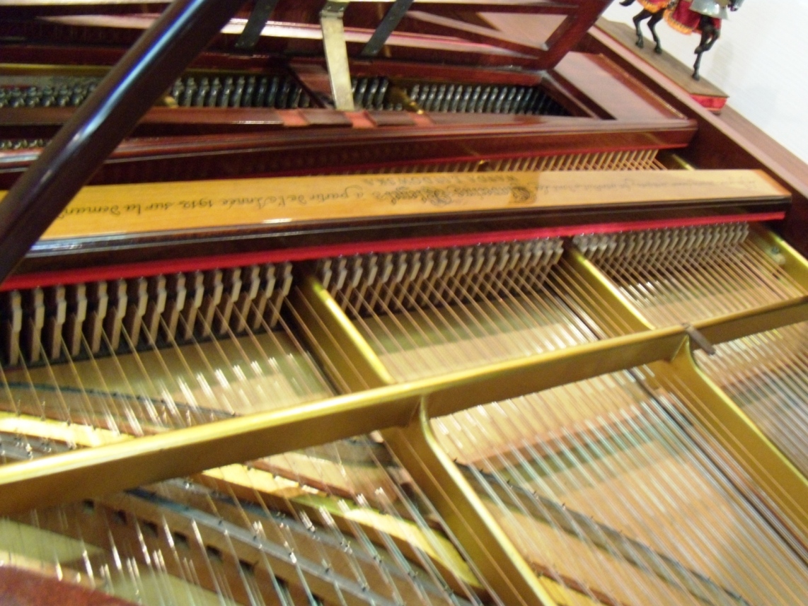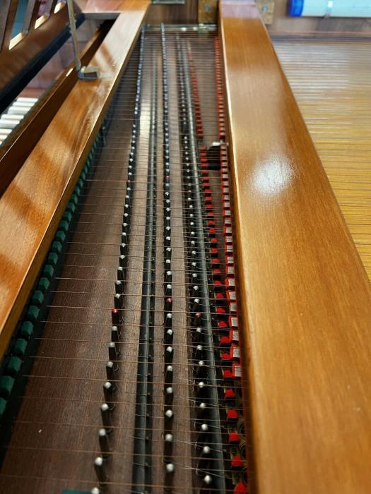 Kassen er forsynet med kraftige bjælker, heljernramme og uden bund som på et flygel. Klangbunden skulle være lamineret af tre lag træ(!) og ialt være 3.6mm tyk. Beribningen på undersiden består af diagonale ribber som på et flygel. Et af problemerne var at 4′ var hæftet på traditionel vis til en forholdsvis spinkel liste, der løb på undersiden af klangbunden, i modsætning til de øvrige strenge der var hæftet til jernrammen. Det betød at alle strengene ikke blev påvirket af fugtighed på samme måde, hvorfor 4′ var svær at holde i stemning til de øvrige strenge. I modsætning til de tyske instrumenter valgte Pleyel at have 4′ på underste manual, så dispositionen var: Manual II: 8’+nasalregister(række af springere som knipser tæt på enden af strengen)+lut, Manual I: 16’+8’+4′, samt kobling. Skift af registrering foregik alene med pedaler. Selv stemmenaglerne var anderledes. Pleyel indførte et finstemningssystem, hvor hver nagle bestod af to dele, den bageste (ind mod broen) del bar strengen, mens finstemningsdelen foran kunne “vippe” den bageste del lidt frem og tilbage, og således finjustere strengen. I princippet en smart ide, men man mister jo den direkte kontakte med strengen, når man skal stemme den.