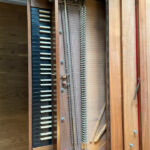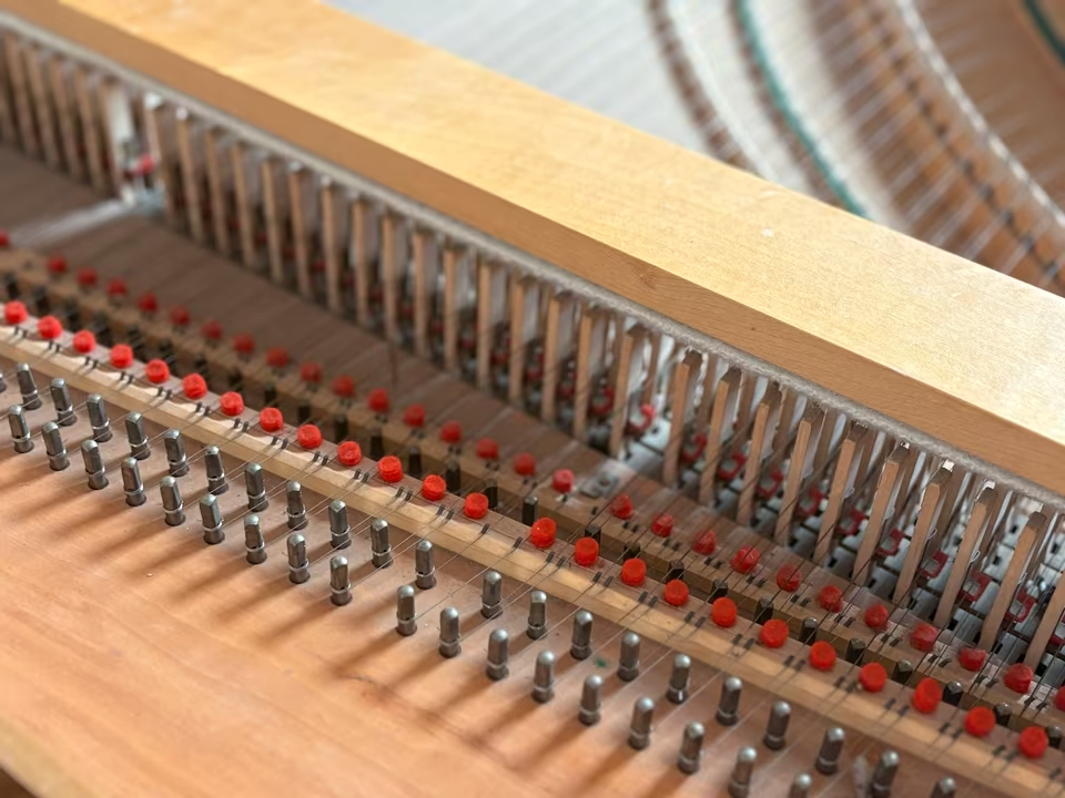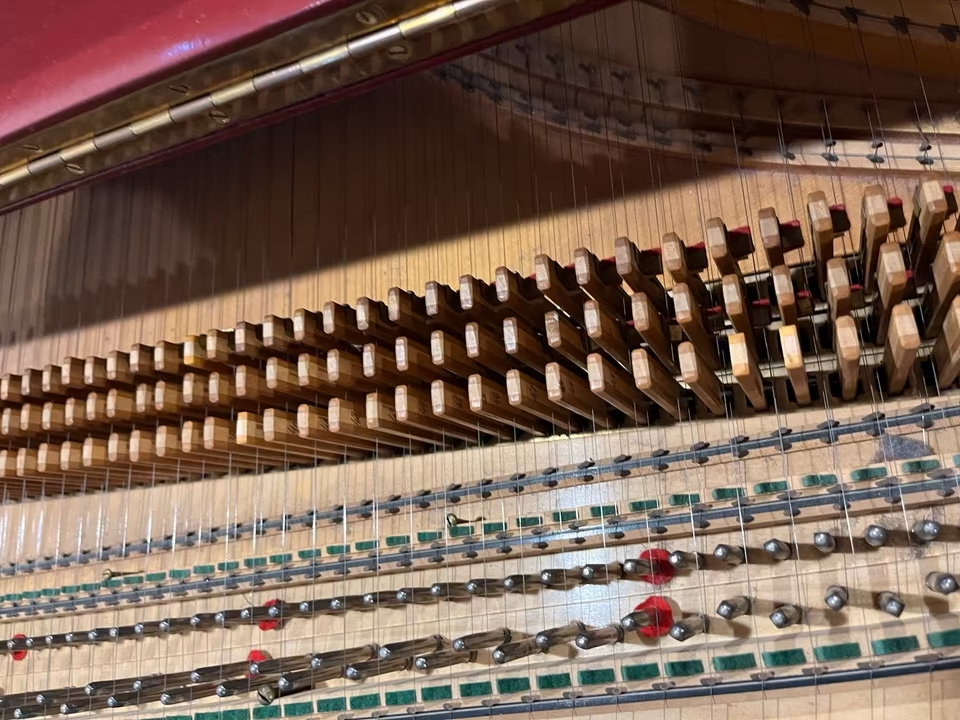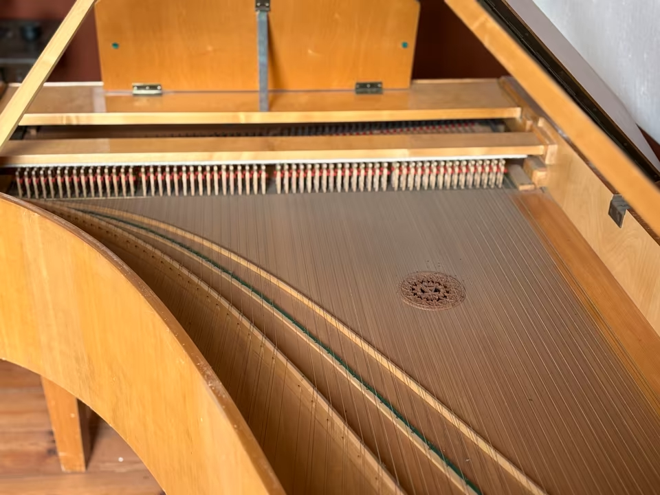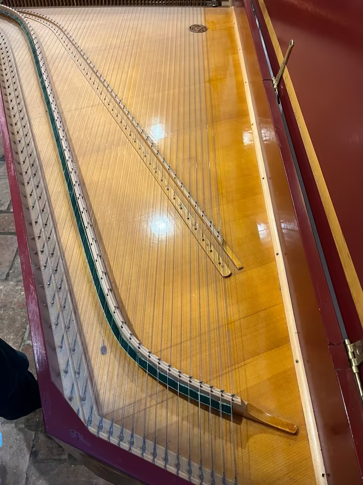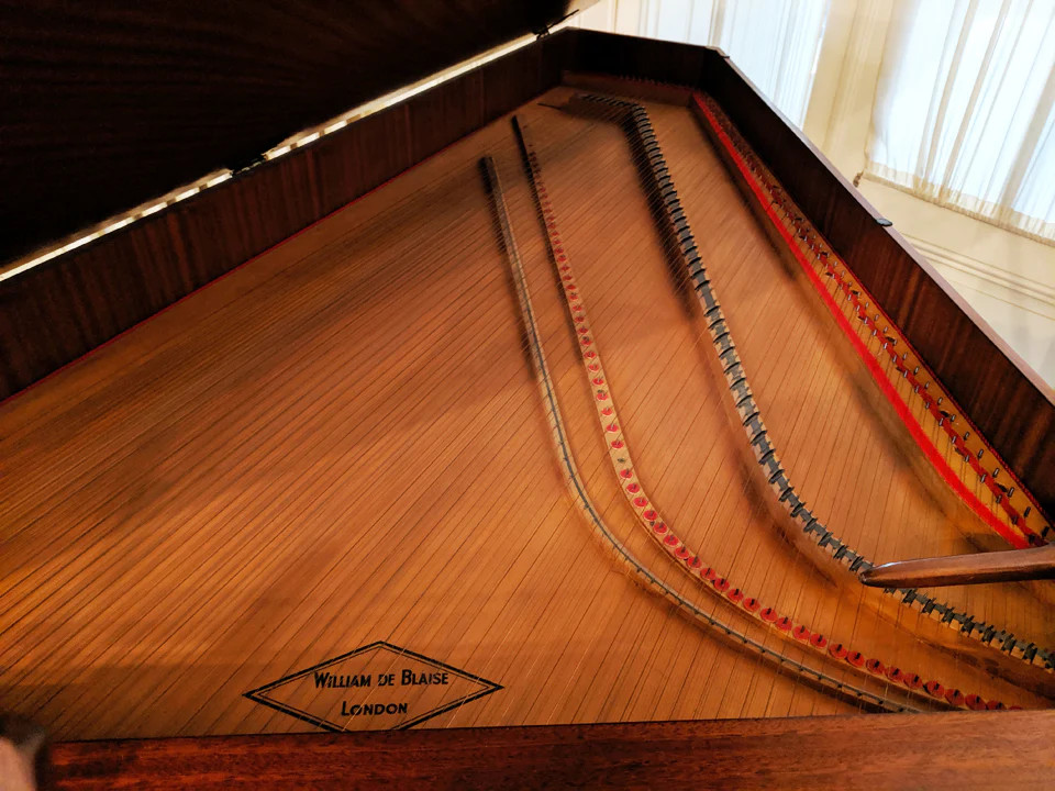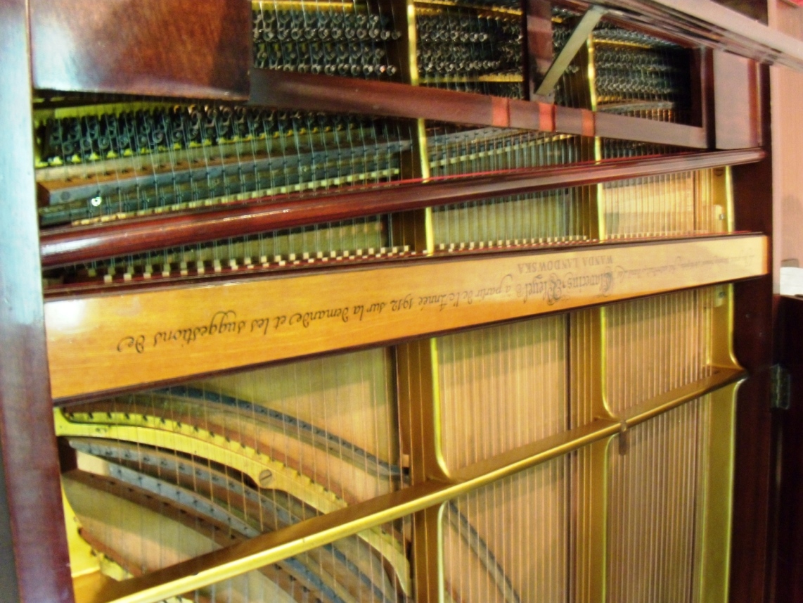 Kassen er forsynet med kraftige bjælker, heljernramme og uden bund som på et flygel. Klangbunden skulle være lamineret af tre lag træ(!) og ialt være 3.6mm tyk. Beribningen på undersiden består af diagonale ribber som på et flygel. Et af problemerne var at 4′ var hæftet på traditionel vis til en forholdsvis spinkel liste, der løb på undersiden af klangbunden, i modsætning til de øvrige strenge der var hæftet til jernrammen. Det betød at alle strengene ikke blev påvirket af fugtighed på samme måde, hvorfor 4′ var svær at holde i stemning til de øvrige strenge. I modsætning til de tyske instrumenter valgte Pleyel at have 4′ på underste manual, så dispositionen var: Manual II: 8’+nasalregister(række af springere som knipser tæt på enden af strengen)+lut, Manual I: 16’+8’+4′, samt kobling. Skift af registrering foregik alene med pedaler. Selv stemmenaglerne var anderledes. Pleyel indførte et finstemningssystem, hvor hver nagle bestod af to dele, den bageste (ind mod broen) del bar strengen, mens finstemningsdelen foran kunne “vippe” den bageste del lidt frem og tilbage, og således finjustere strengen. I princippet en smart ide, men man mister jo den direkte kontakte med strengen, når man skal stemme den.