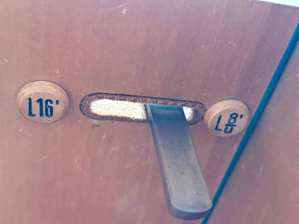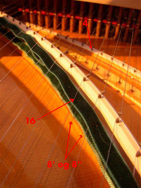 Strengelængder for 8′ (cm)’: 17,1 (c”’), 34,8 (c”), 69,8 (c’), 116,5 (c) og 136,6 (C). Strenglængder for 4′: 8,3 (c”’), 17,3 (c”), 33,8 (c’), 58,0 (c) og 73,6 (C).