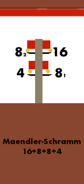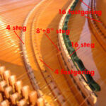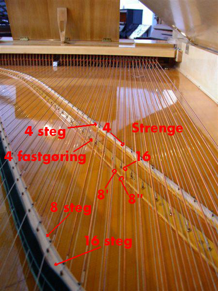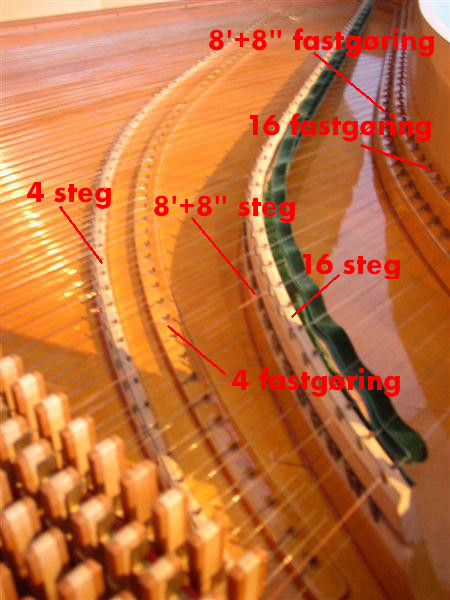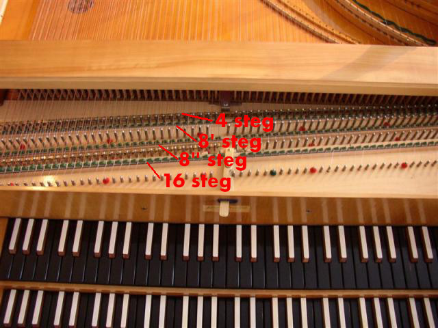 Det moderne cembalo i det 20. årh. ønskede at udvide med et 16′-register. Ofte brugte man samme steg på klangbunden ti at bære både de to sæt 8′ og 16′, hvilket betød at 16′ strengene blev alt for korte og måtte være omspundne gennem hele registret med dårlig klang til følge. De få historiske eksempler på brug af 16′ har ofte strengene placeret på en særskildt steg på egen klangbundsdel. Det er helt klart en bedre løsning, men giver naturligvis et længere instrument (+270cm). Nedenfor ses eksempler fra to Sperrhake instrumenter (det samme gælder for Neuperts og flere andre byggeres instrumenter). Bemærk at de to sæt 8′ strenge er placeret på hver deres niveau i stedet for på samme steg! Det betyder, at de har hver deres steg på stemmestokken, og at det ene sæt dermed er 5-7cm kortere end det andet, med en betydelig klangforskel som følge. Instrumentet af Maendler-Schramm har på en snu måde klaret sig med kun to niveauer med den ene 8′ placeret sammen med 4′. Det betyder dog at 8′-strengene passerer tæt henover 4′-steget på klangbunden for at nå ud til 8′ steget. Her passerer strengene gennem huller til fastgøringslisten, hvor 16′ og så er fastgjort. Bemærk at Neupert og Sperrhake har strengen siddende lige over hinanden, mens man historisk (og på Maendler-Schramm) har forskudt dem, for at give plads til flagdæmperne.