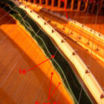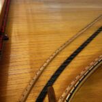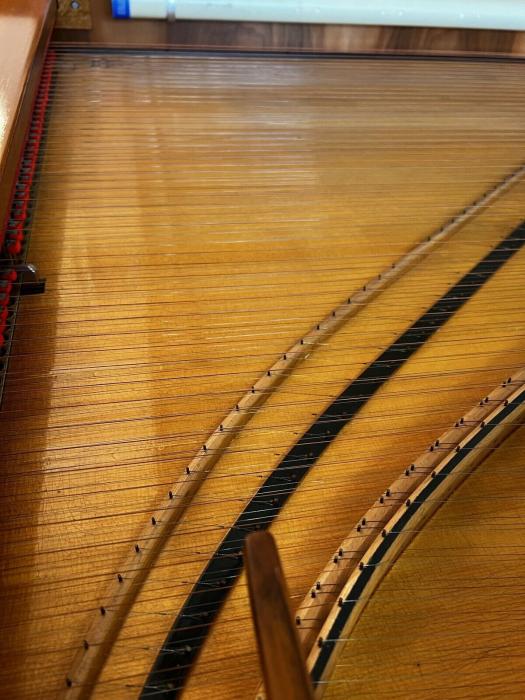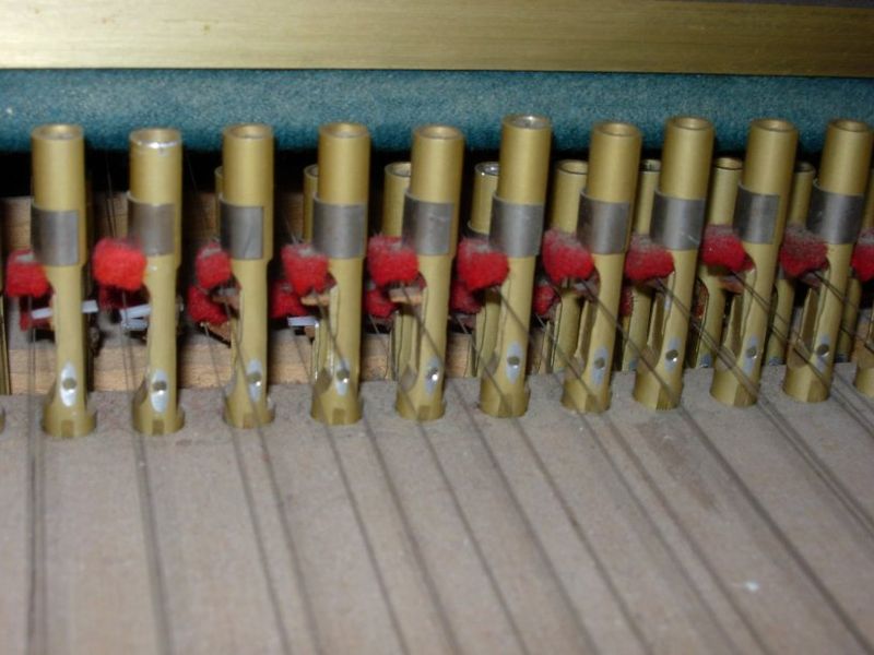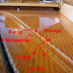 Da strengene ikke er så lange i diskanten kan vi i designet af strengudlægget følge den pythagorianske teori og så gradvist mod bassen afvige fra denne og kompensere med gradvist tykkere strenge. Vi kan godt gøre strengene gradvist tykkere, men i praksis fremstilles de i bestemte tykkelser og overgangene mellem tykkelserne vil – afhængigt af designet – kunne høres, ligesom skift til et andet materiale også vil ændre klangens karakter. Et godt strengudlæg, dvs. med en nogenlunde ensartet klangkarakter kræver, at der tænkes i en passende sammenhæng mellem den gradvise forkortning af strengene mod bassen og en passende anvendelse af tykkere strenge med evt. skift til et tungere materiale for de dybeste toner i bassen. Typisk opstrenges nordeuropæisk inspirerede instrumenter med jern i diskanten, skiftende til gul messing i bassen og rød messing på de allerdybeste toner. Midteuropæiske og italienske instrumenter har ofte været strenget op helt i messing.