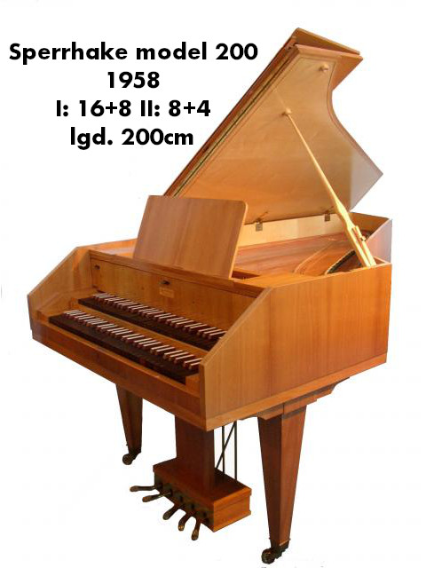 Model 200 af Sperrhake er større og har to manualer samt fire sæt strenge: 16’+8’+8’+4′. Kassen er dog kun 200cm lang, hvilket giver en strengelængde til både 16′ og 8′, der er meget langt fra den teoretiske længde. Dette kan kun lade sig gøre ved udstrakt brug af omspundne strenge med ringe og svag klang til følge.