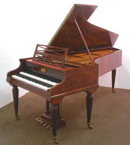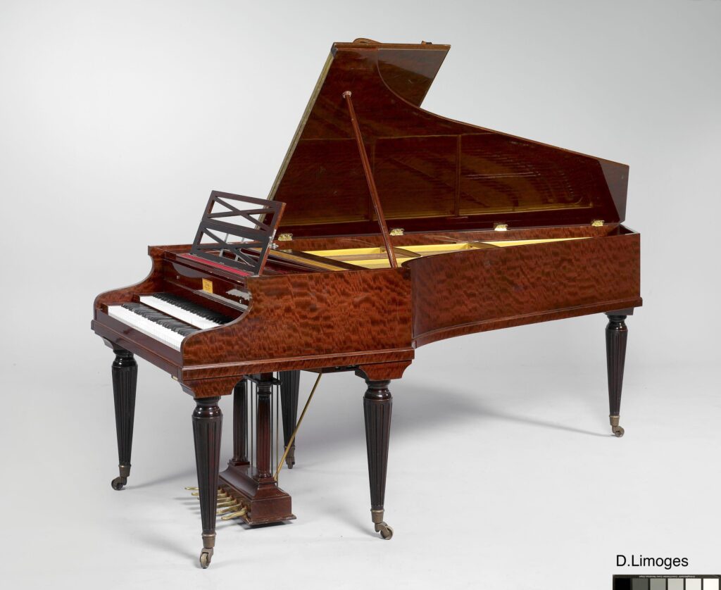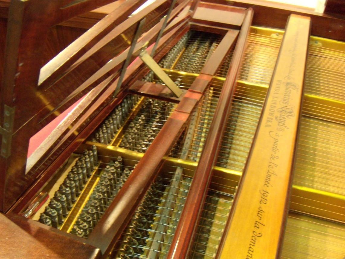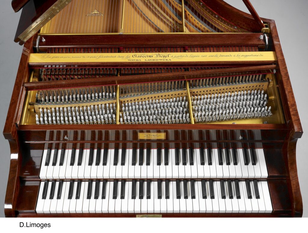 Pleyel var en klaverfabrikant, som byggede sit første cembalo til verdensudstillingen i Paris, 1889 (Se artikel her). Deres instrumenter drog meget hurtigt glæde af firmaets evner indenfor klaverbygning og indførte jernramme til at holde strengene. Mødet med Wandowska afstedkom at de i 1912 indførte et 16′ register i deres største koncertinstrument (“Grand Modélè de Concert”). Dette er et massivt instrument med fire sæt strenge (16’+8’+8’+4′), pedaler til skift af register, overliggende dæmpere, jernramme og mange andre nyskabelser. Pleyel havde – det nok i praksis fornuftige – udgangspunkt, at hvis 16′ skulle blive en succes med de meget korte strenge, der var muligt, så skulle de anvende et højt strengetræk og tunge omspundene strenge i hele 16′. Det fordrede til gengæld en kasse, en klangbund og en mekanik, der kunne klare det. Mensur: c”: 33cm. Længste streng (F’): 172,7cm. Tyndeste streng i 16′ (f”’) havde en diameter på 0,27mm og omspunden, mens den tykkeste streng (F’) var en omspunden streng på hele 2,7mm! Totalt strengetræk: ca. 2 tons (mod under ca 800kg for et stort historisk baseret cembalo). For at kunne sætte disse strenge i bevægelse krævedes meget kraftige og store læderplektre samt et tastatur i klaver-/orgelstil med pedalbetjent kobling. De to manualer lå meget tæt sammen, hvilket gjorde det muligt at spille på begge manualer med een hånd. Når først strengene blev sat i svingerne er det klart, at normale historiske flagdæmpere ikke var nok til at dæmpe dem – derfor indførte Pleyel “overliggende” dæmpere, dvs særskilte “filthamre” som havde skafter, der gik over springerne, som derfor hævede dæmperne, når de blev aktiveret.