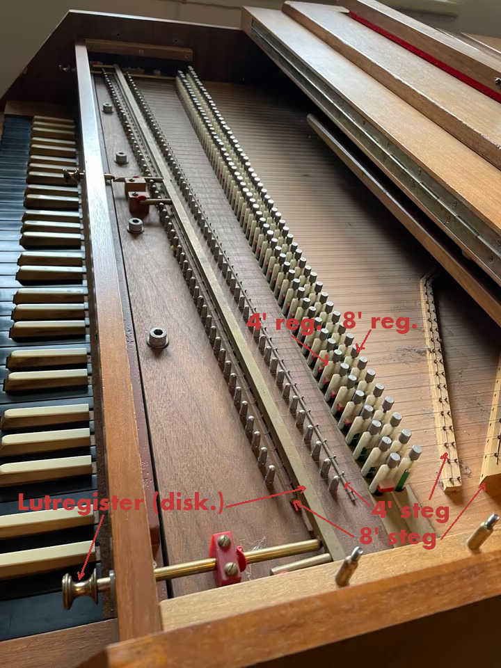 I de instrumenter, hvor 4′ var placeret på øverste manual (den såkaldte “Bach”-disposition) erindrer jeg at cembalister fortalte at det var umuligt at balancere de to manualer med mange registerskifte til følge. Visse cembalister skiftede så hyppigt register, at det må have været en betragtelig dele af deres instudering at beslutte sig for registreringen.