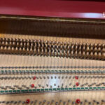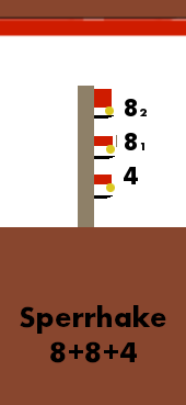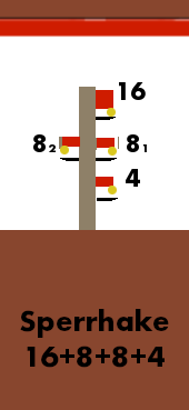 Sperrhake var et tysk firma, som har bygget i hundredevis af cembaloer og de er meget almindelige i Tyskland. Nedenstående er et tomanuals instrument med 8’+8’+4′. Bemærk det noget usædvanlig design med de tre strengesæt anbragt lige over hinanden. Det betyder at de to 8′ ikke har samme længde, hvilket ikke er optimalt i forbindelse med opstrengning, stabilitet og klangkvalitet. 8′-strengenes steg på klangbunden er ligeledes i to “etager”, hvor det nederste passerer gennem huller i steget til fastgøringslisten i kanten af den buede side. Det besynderlige design er måske et resultat af, at de brugte samme design af steget til både modeller med og uden 16′? Bemærk dekorationen, som er inspireret af et historisk fransk design fra 18.årh. med guldbånd.